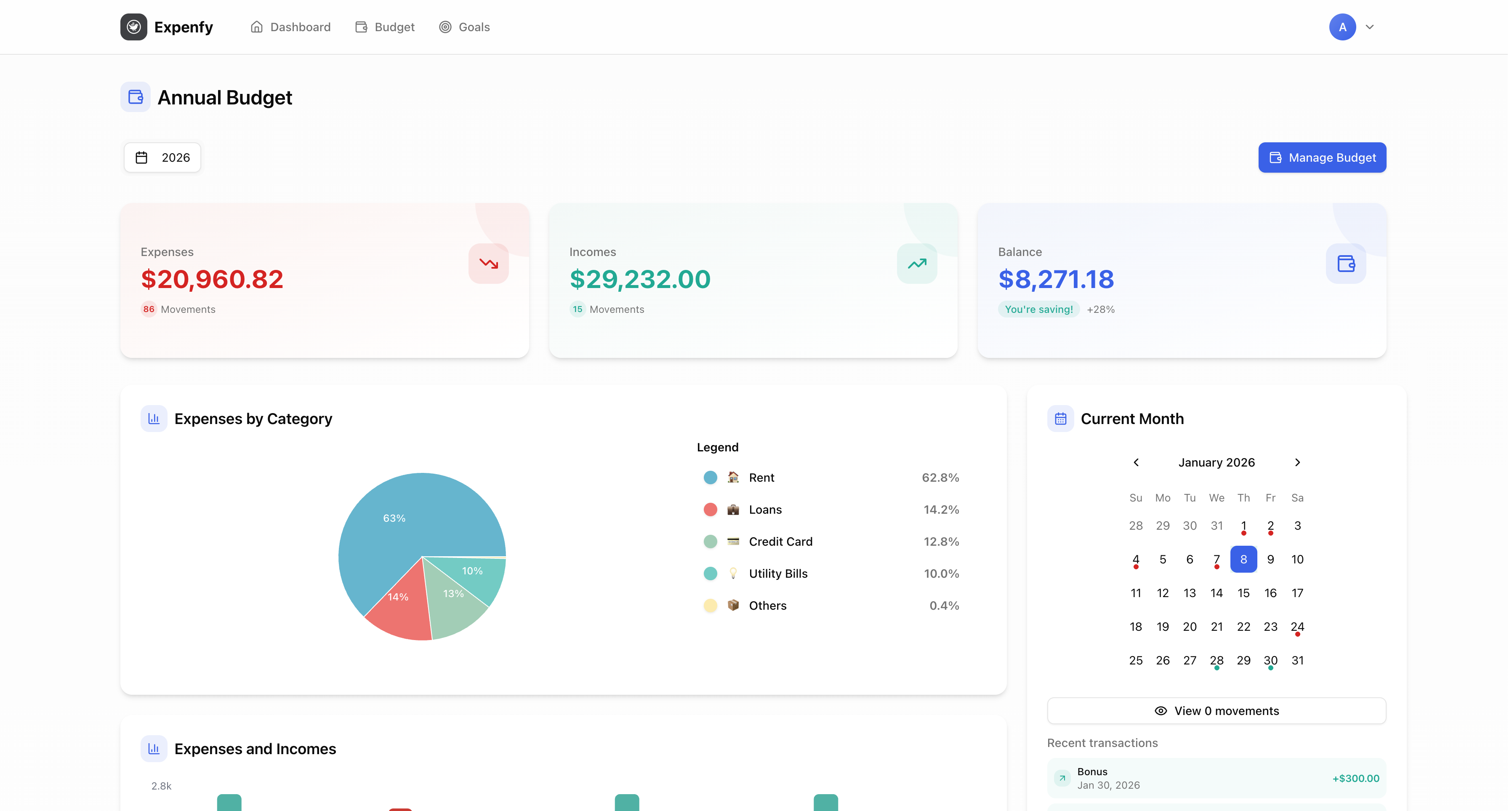 Get a clear overview of income, expenses and balance to understand your financial health.